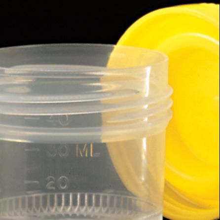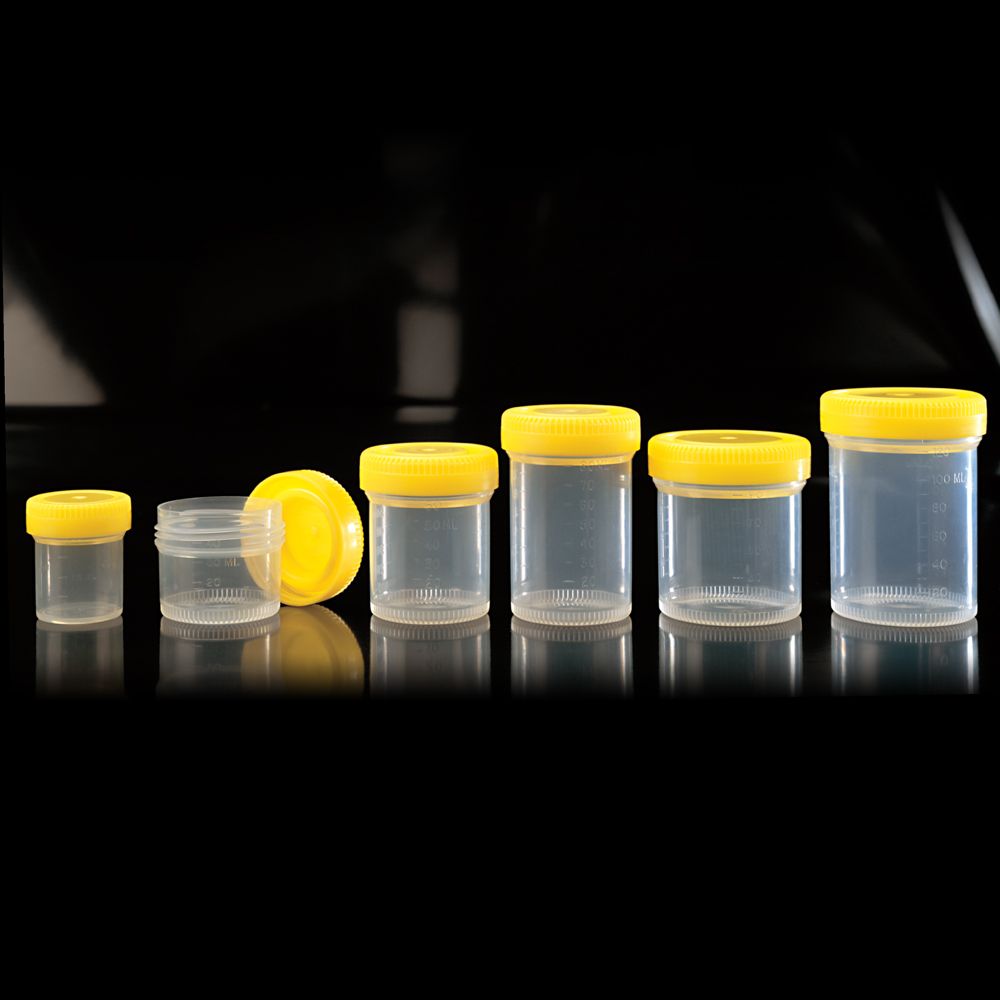 Porok, folyadékok és mikrobiológiai minták tárolásásra alkalmas edények biztonsági zárású sárga, csavaros kupakokkal.