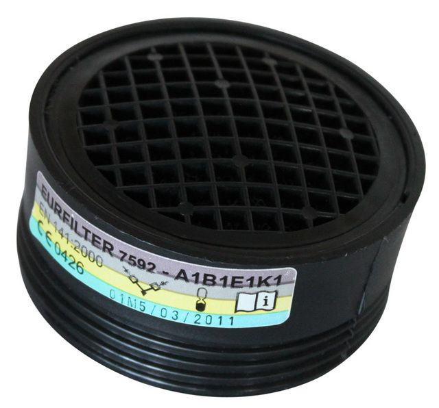 ABEK1 szűrőbetét: 65 °C-nál magasabb forráspontú oldószerek, szerves gázok és gőzök, szervetlen gázok és gőzök (kivéve szén-monoxid), kén-dioxid és savas gázok, valamint ammónia és szerves amin-származékok ellen 0,1 tf% koncentrációig