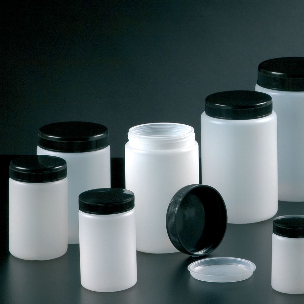 Csavaros kupakkal és belső dugóval ellátott széles szájú edények.